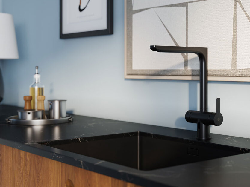 Den sorte indretningstrend er kommet for at blive, og det er vi glade for. Ved at vælge et sort armatur tilfører du køkkenet et moderne touch, og du kan med fordel kombinere armaturet med andre farver og materialer.