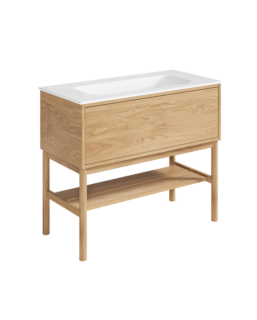 Keraamiline valamu, valge, 2 segistiauku, heledast tammepuidust jalgadega raam