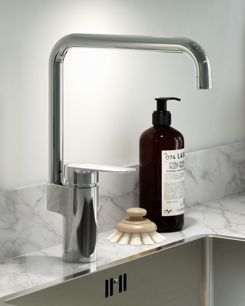 - 110° kääntyvä juoksuputki (sisältäen rajoittimen 0° ja 60°) Vivussa selkeä värillinen kuuman ja kylmän veden merkintä Soft move-teknologia saa kahvan kääntymään pehmeästi ja tarkasti