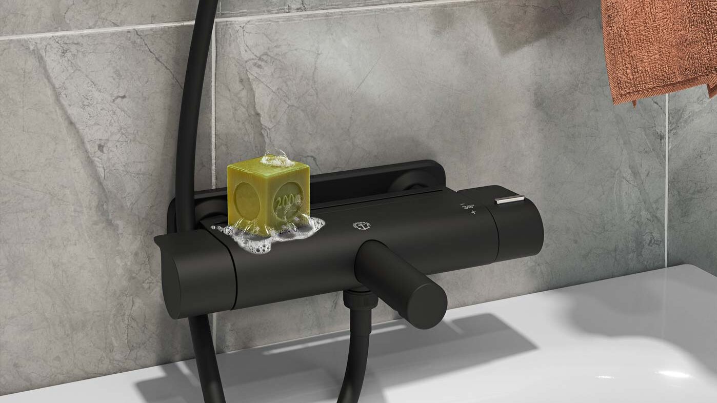 Även seriens dusch- och badkarsblandare är designade för att vara sköna att både använda och se på. De runda, rena formerna är återkommande, och här kan du välja mellan krom och matt svart. Med en smart Click on-hylla döljer du infästningen på ett elegant sätt samtidigt som den skapar mer avställningsyta för tvål, badsalt eller kanske något svalt att dricka.